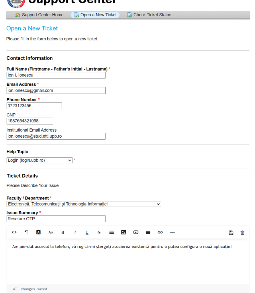Pentru a primi un alt cod QR și a putea configura un nou generator de OTP, trebuie să deschideți un tichet pe ticketing.upb.ro. Selectați opțiunea „Open a New Ticket” și completați câmpurile precum în imaginea de mai jos: